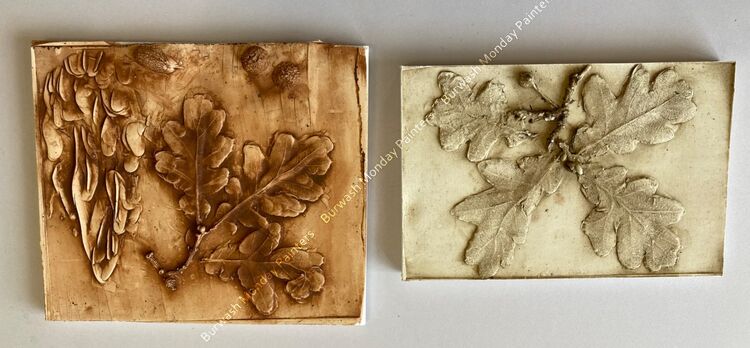 Inspired by our session, one member at home used oak leaves and acorns to make an impression in clay. Next they cast tiles from the clay moulds, using Plaster of Paris.